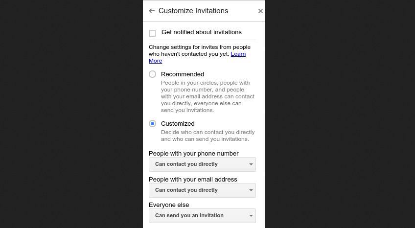 If you choose the latter, there are three existing categories: people who have your phone number, people who have your e-mail address and everyone else. Each of the previously mentioned categories have the following options: direct contact (write to you on Hangouts), invite you to chat or can't contact (which completely blocks the people in that respective group). Additionally, there are also a few options that you can use for those already in your groups or circles and customize how they can contact you.
