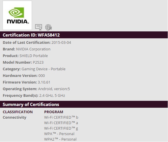 The Bluetooth (spotted by a Chinese website Juggly) and Wi-Fi (spotted by Liliputing) certifications show that NVIDIA Corporation certified a “Portable Gaming Console” together with the above-mentioned set-top box, which might also mean that the the alleged second-gen SHIELD will be equipped with Tegra X1 Super Chip. According to Wi-Fi specs the new console will also be running “Android version: 5” which is most likely to be Lollipop. Just as a reminder, the original portable console is still running KitKat. For more specs, check the images below.